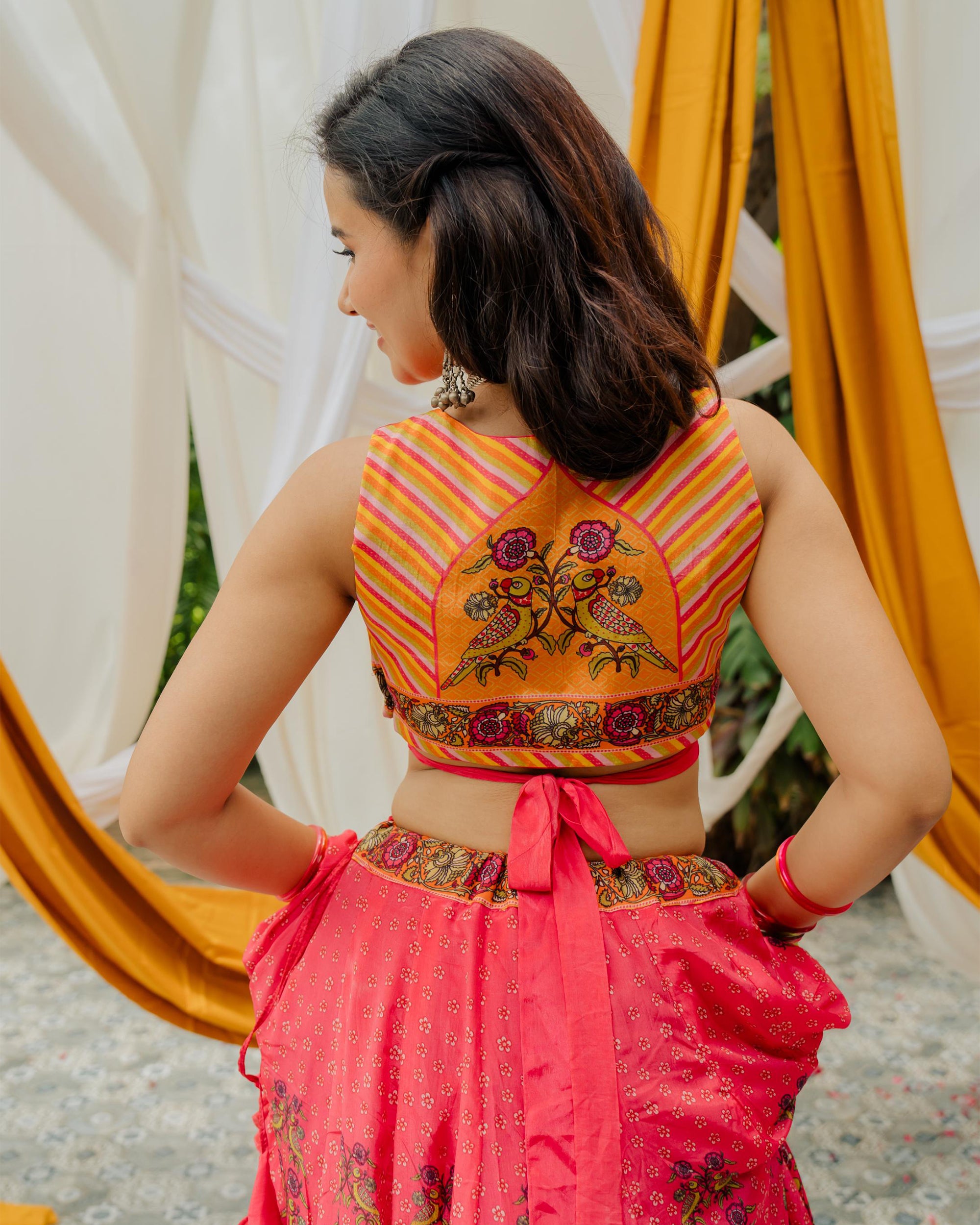 Step into effortless elegance with this pink lehenga set from our Kalamkari Collection, made in 100% pure crepe silk. Adorned with charming parrot motifs in delicate digital Kalamkari prints, the lehenga features a stunning 10-meter flair that adds graceful volume and movement. Lightweight and flowy, the set comes with a matching blouse piece and dupatta—perfect for festive days and special evenings.
