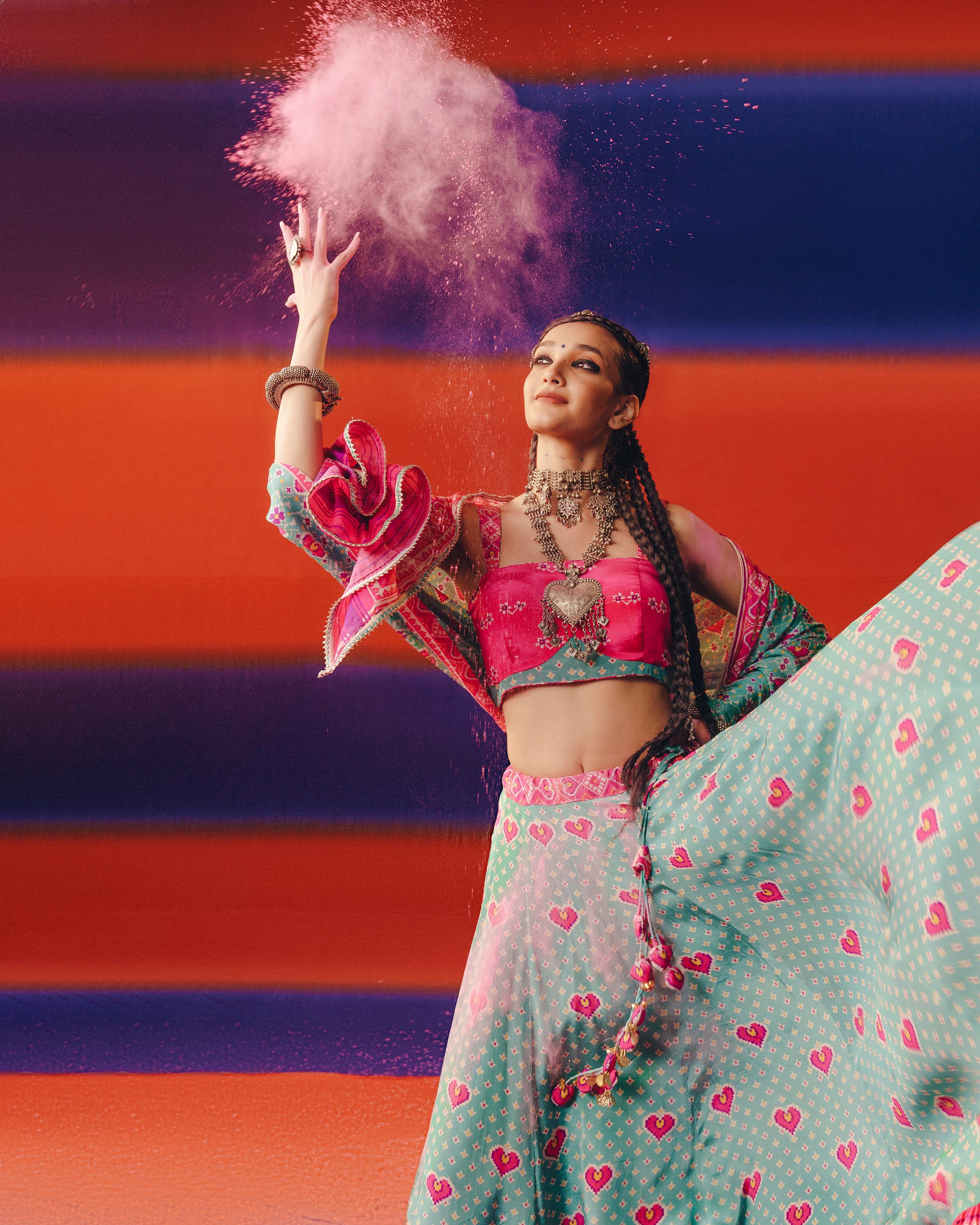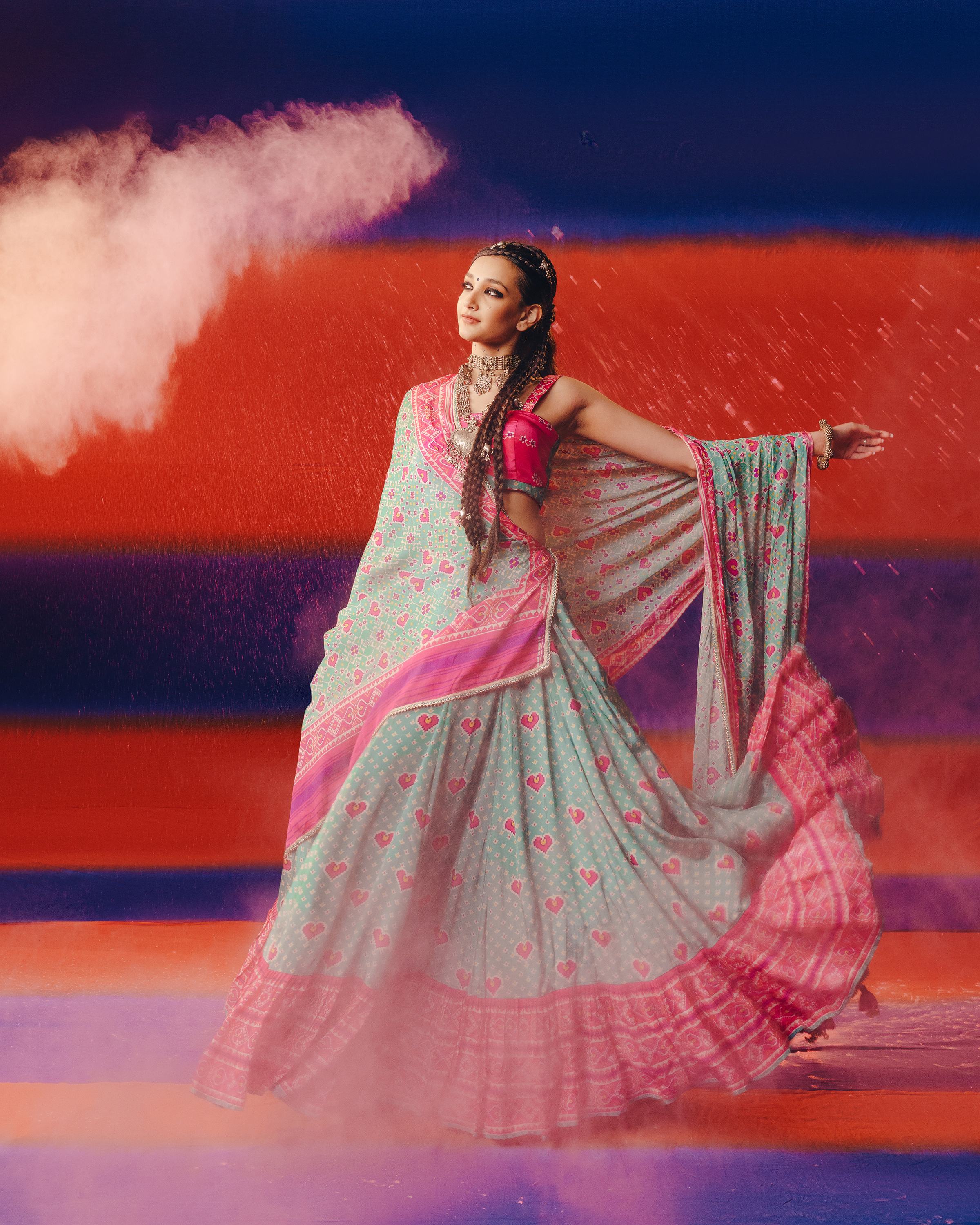 Playful yet rooted in tradition, this pink and blue heart Patola lehenga set is crafted in 100% pure crepe silk. Featuring bold Patola prints with charming heart motifs and a voluminous 16-meter flair, it blends cultural nostalgia with contemporary romance—perfect for festive twirls and joyful celebrations.