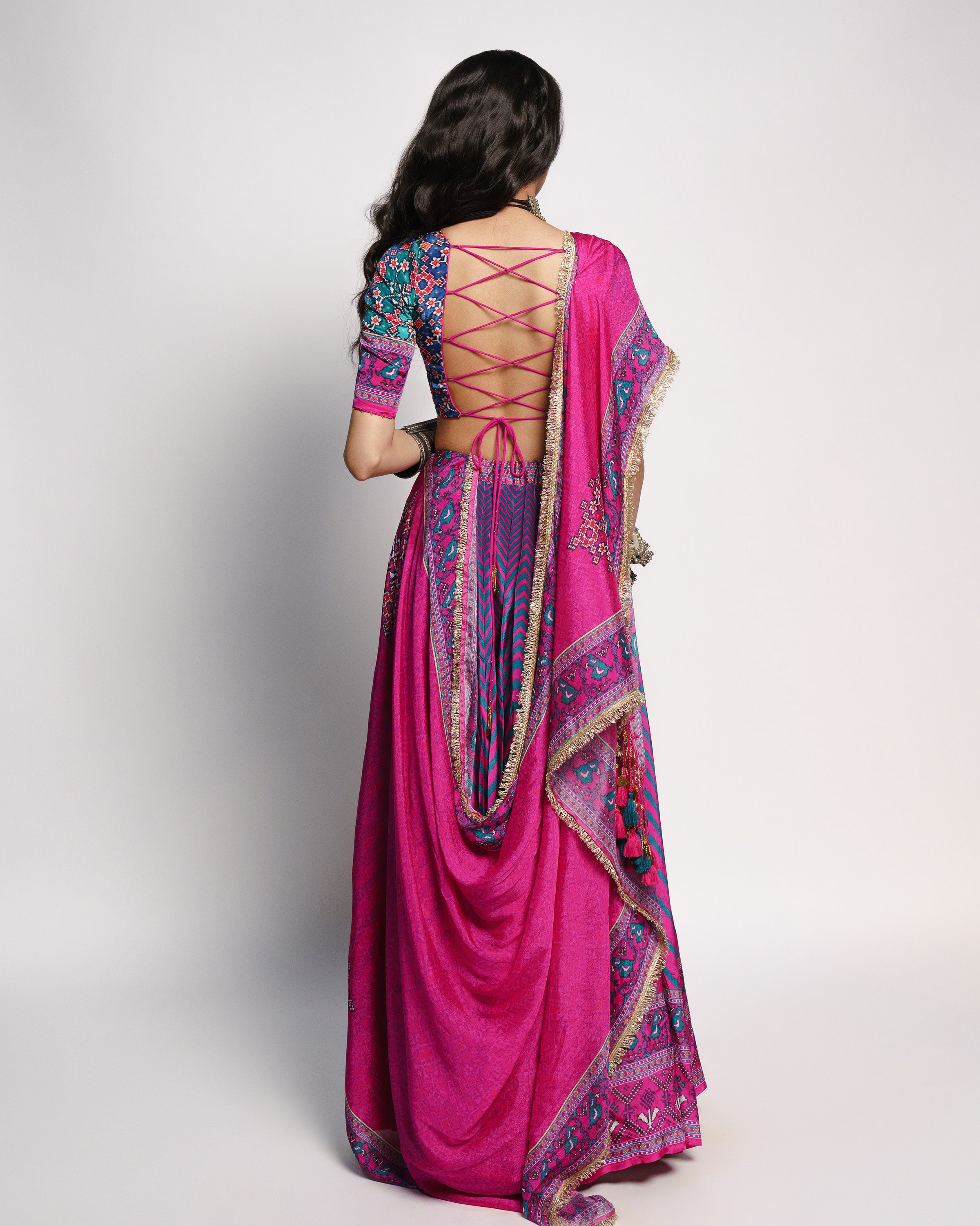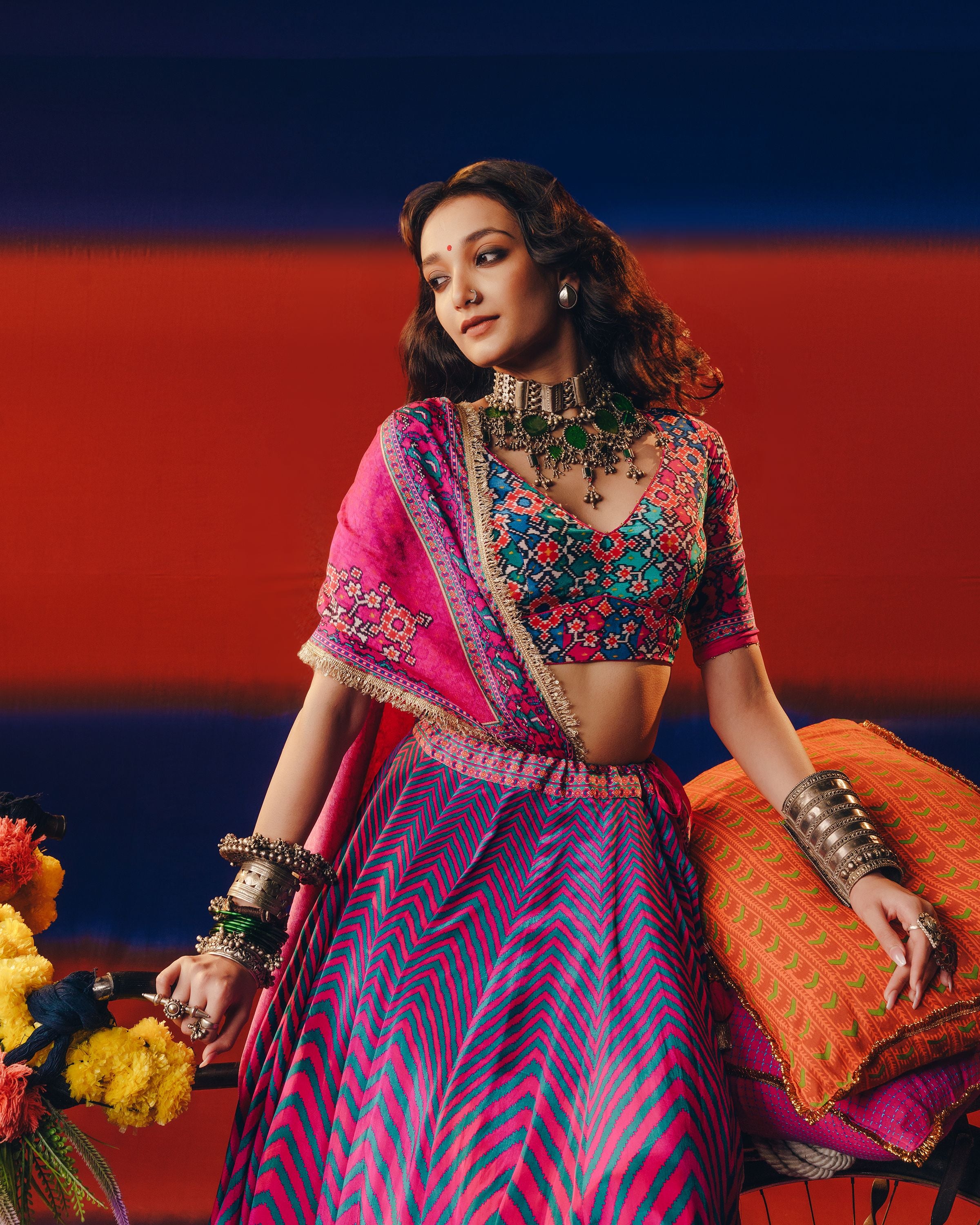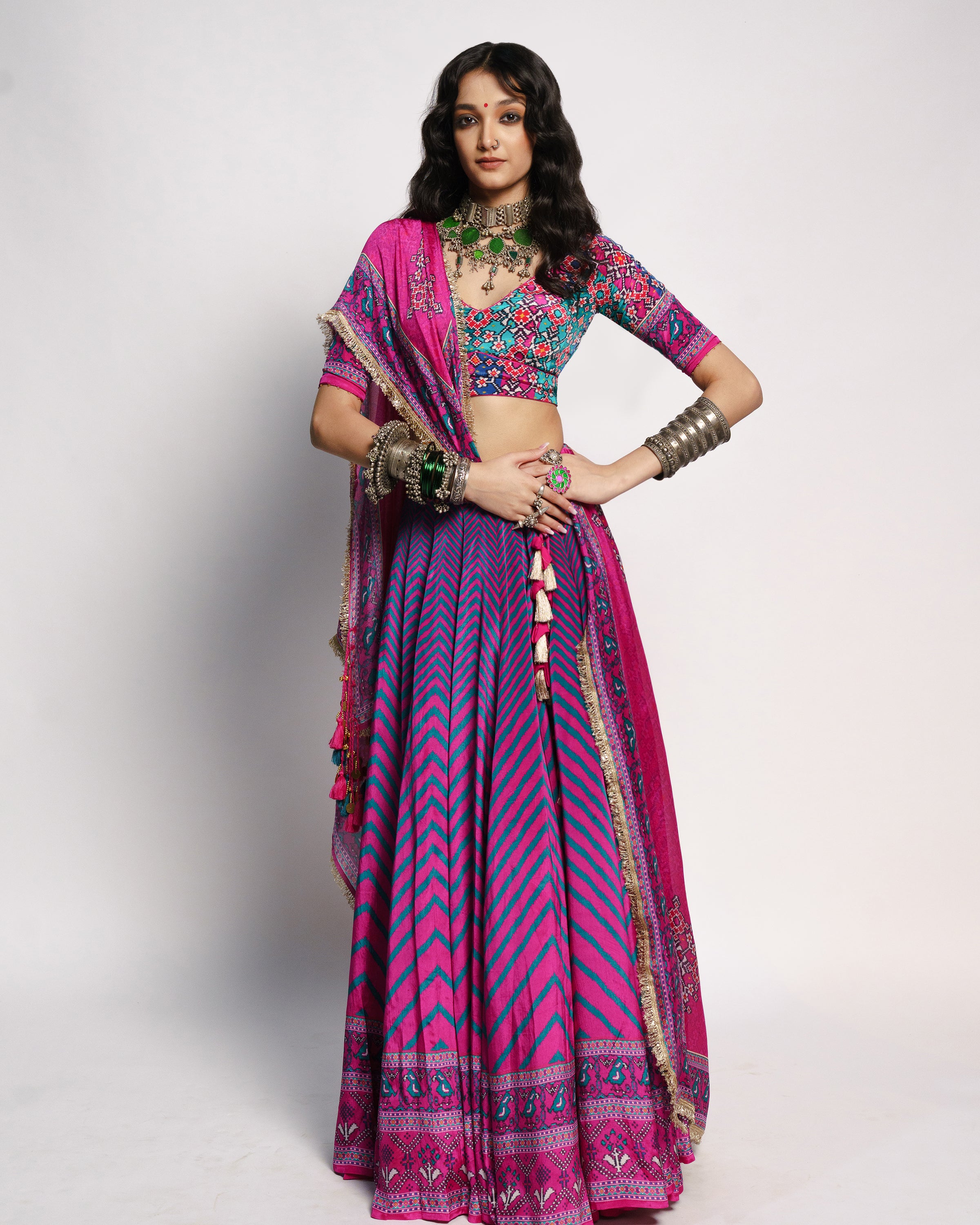 Fresh and vibrant, this sea green and pink lehenga set is crafted from 100% pure crepe silk. Featuring a striking Patola chevron print in the lehenga with a graceful 10-meter flair paired with a multicolour Patola blouse, this set brings effortless elegance to festive dressing.