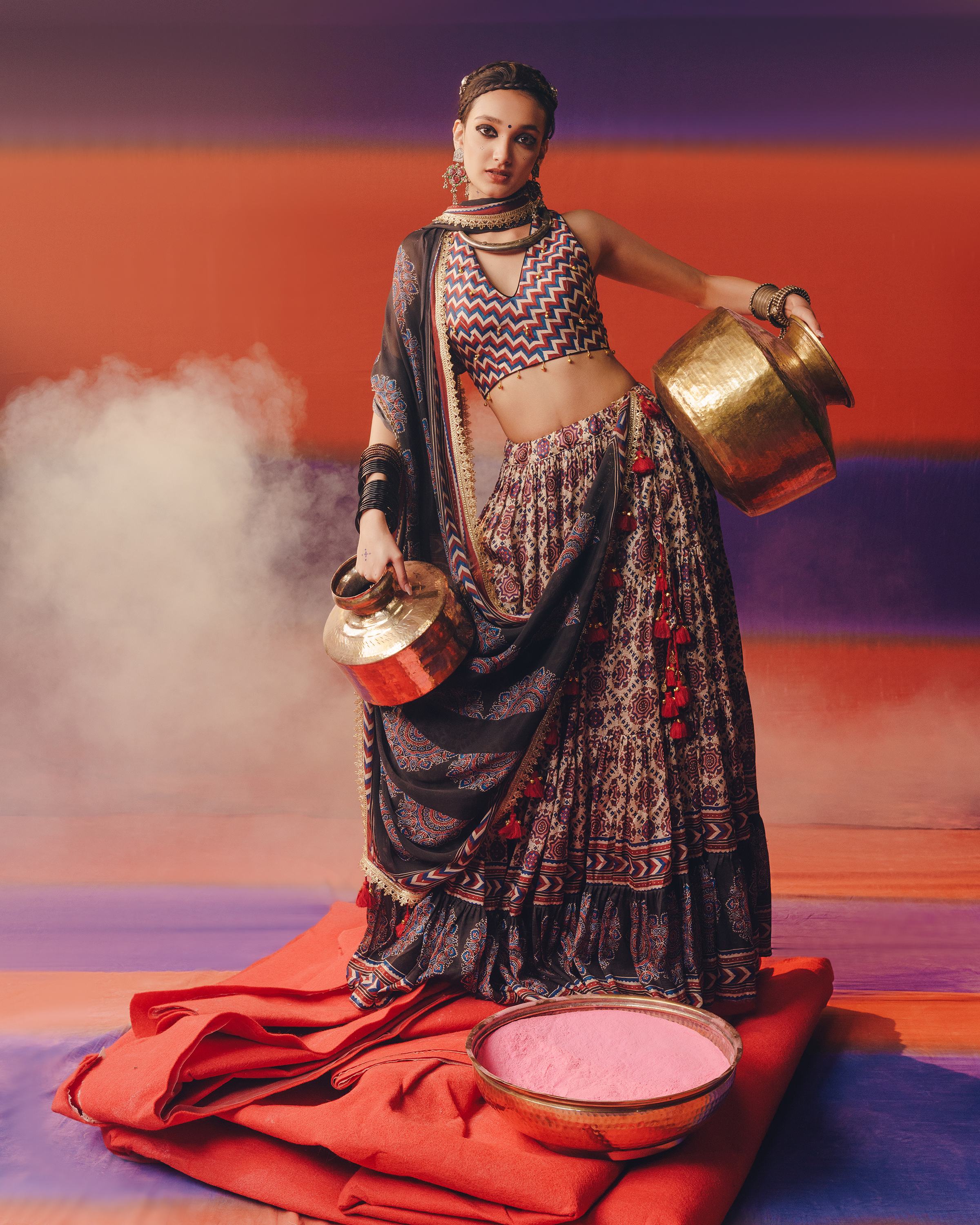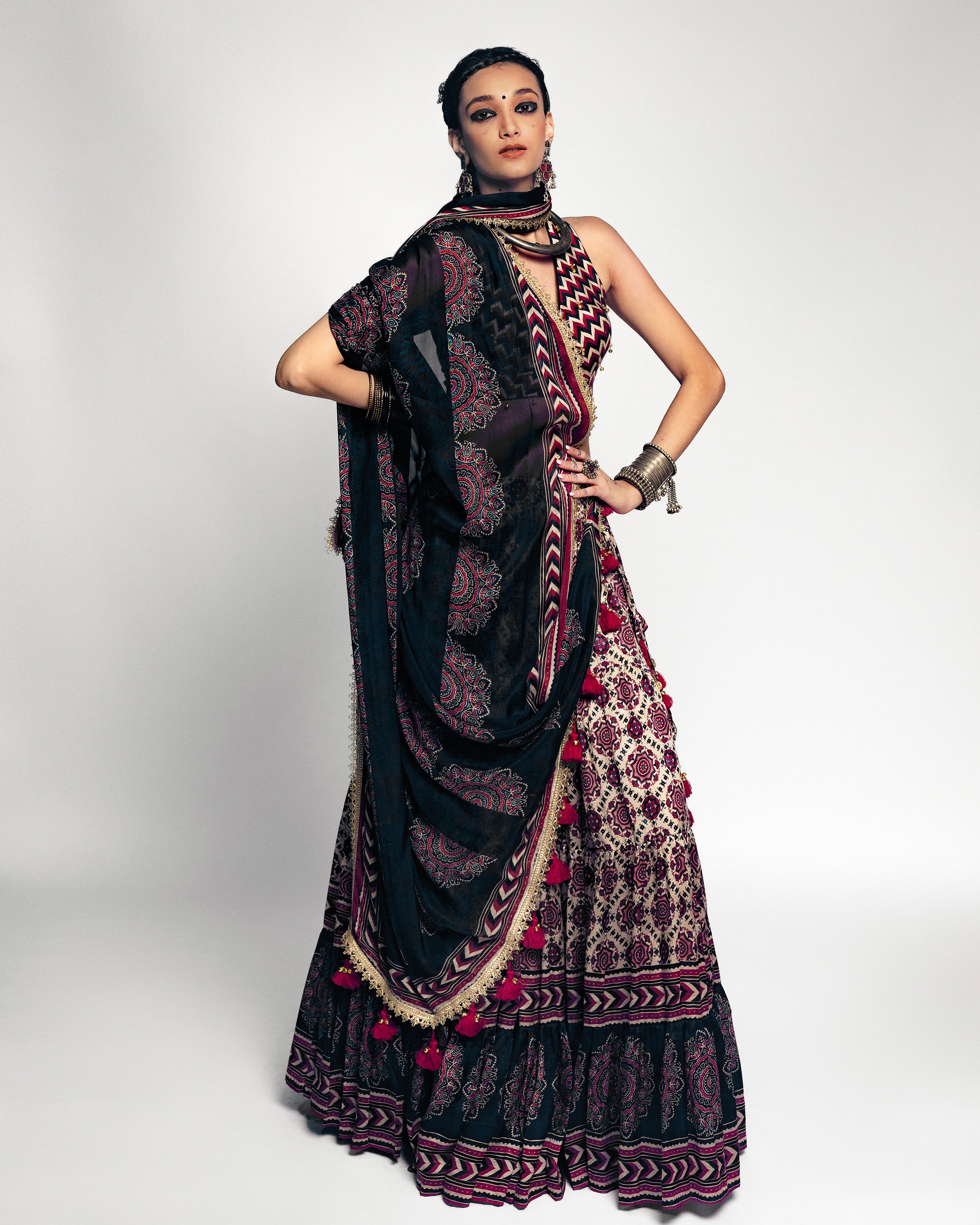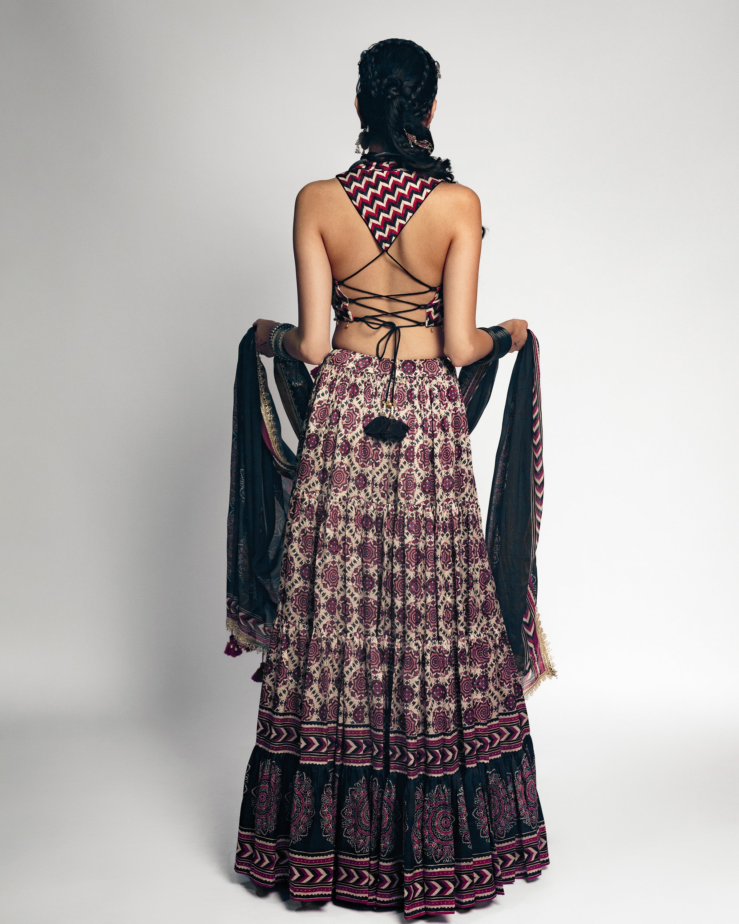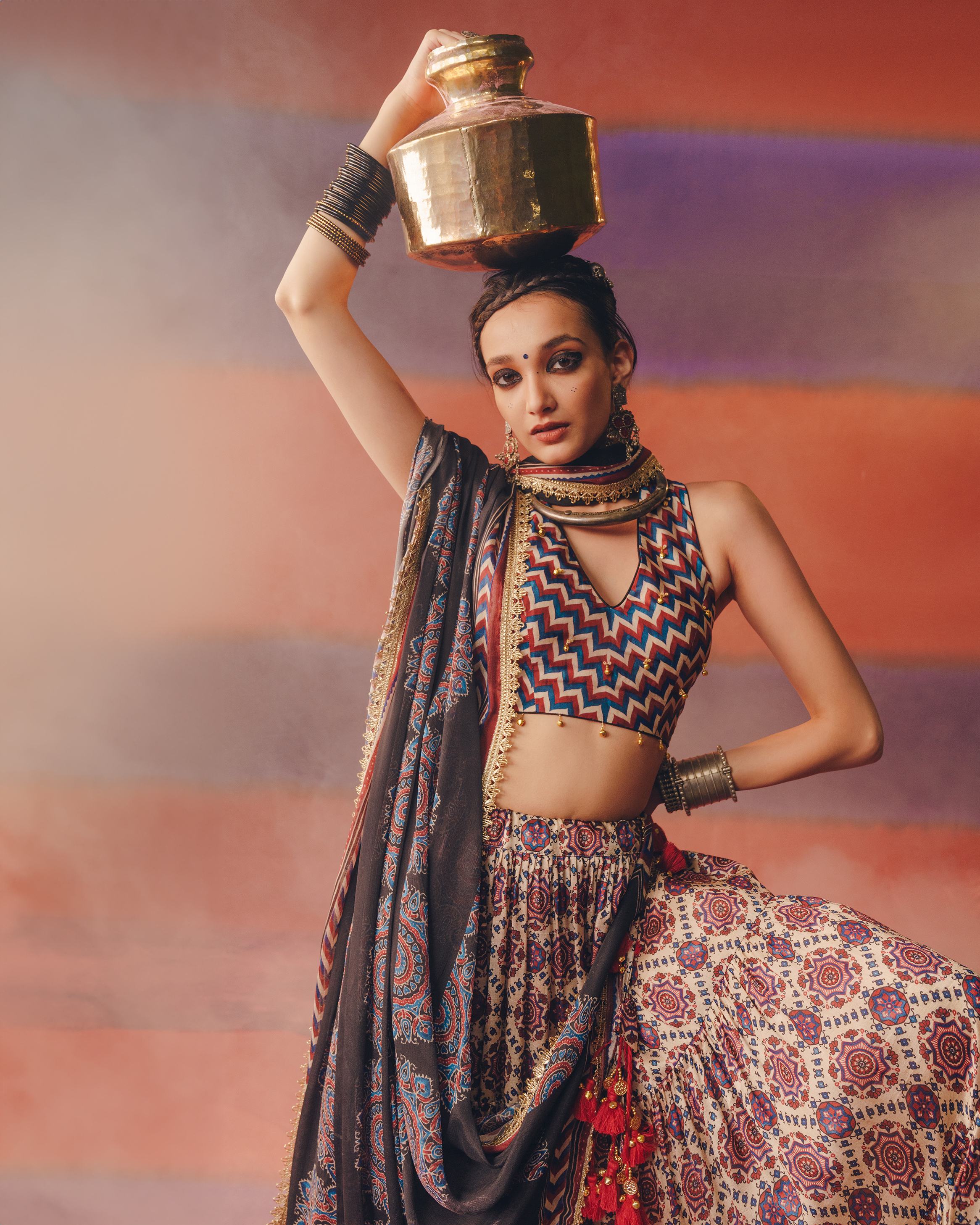 Subtle yet striking, this lehenga set in cream features timeless Ajrakh prints on pure russian silk. Designed with a flowing 16-meter flair and lined with soft cotton lining for effortless comfort, this ensemble blends earthy elegance with modern minimalism—ideal for heritage celebrations and soulful gatherings.